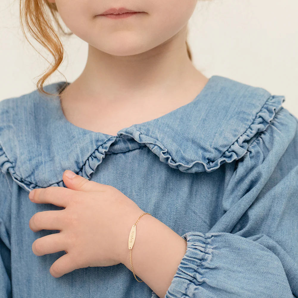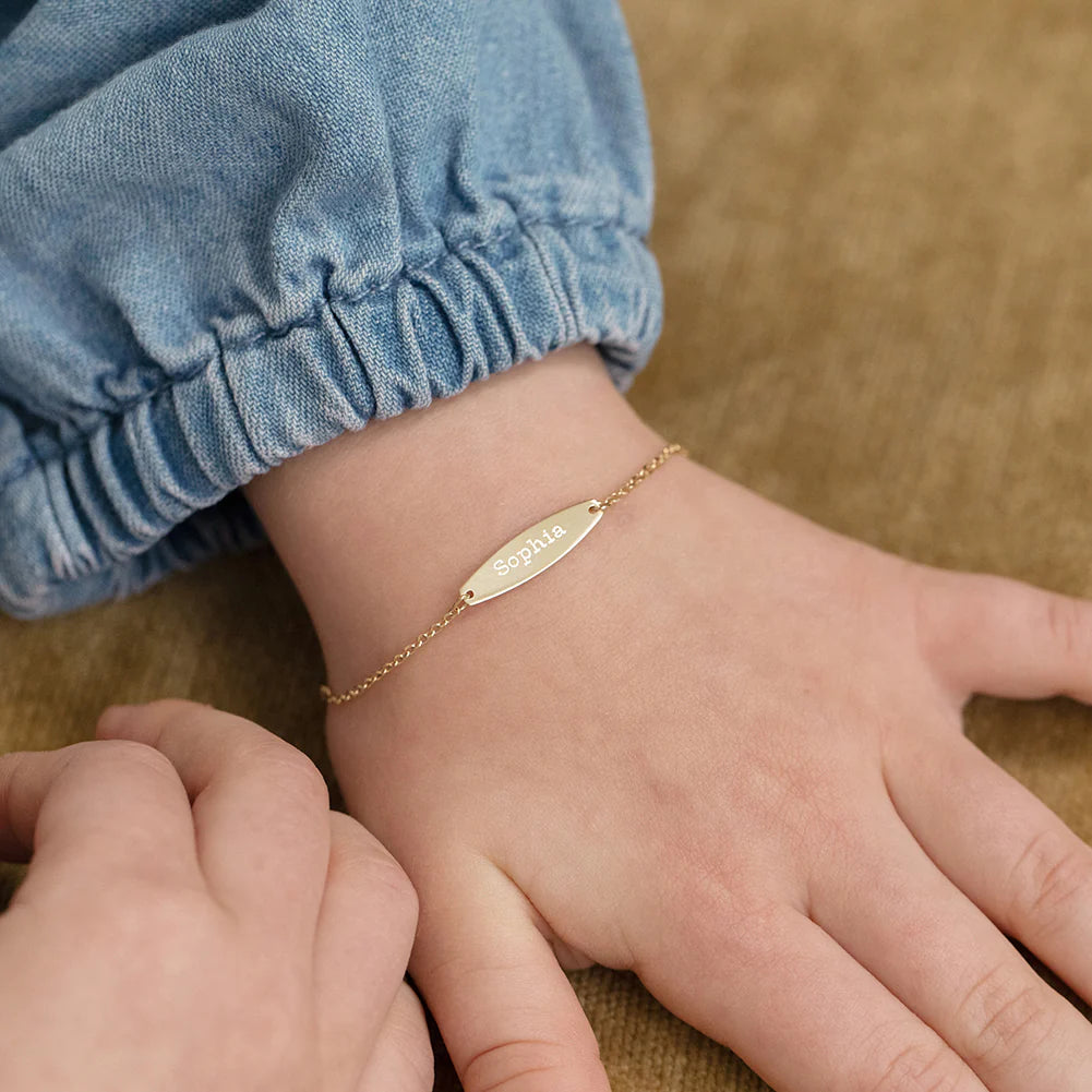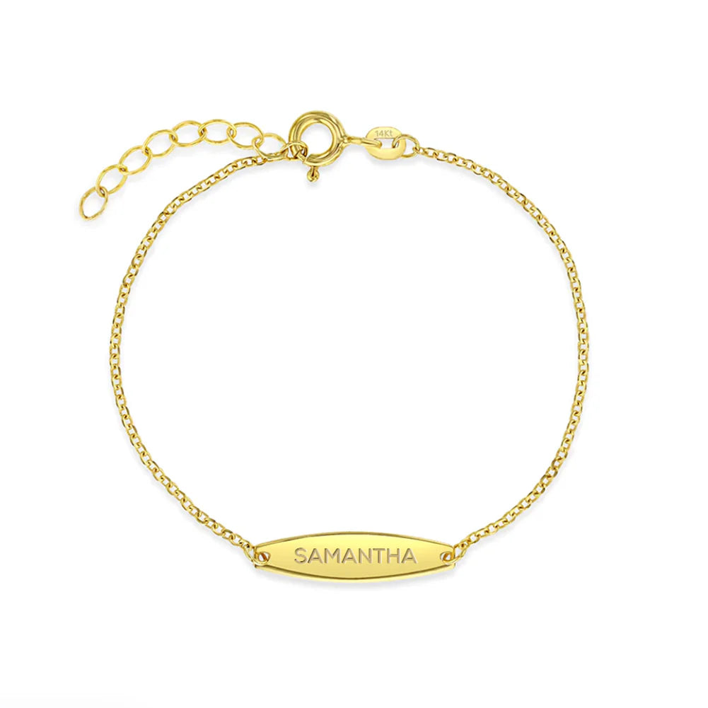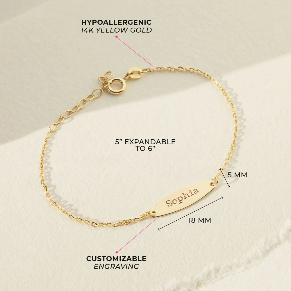 Pulsera clásica de identificación para bebé con etiqueta grabable de oro de 14 quilates (14 a 15 cm)