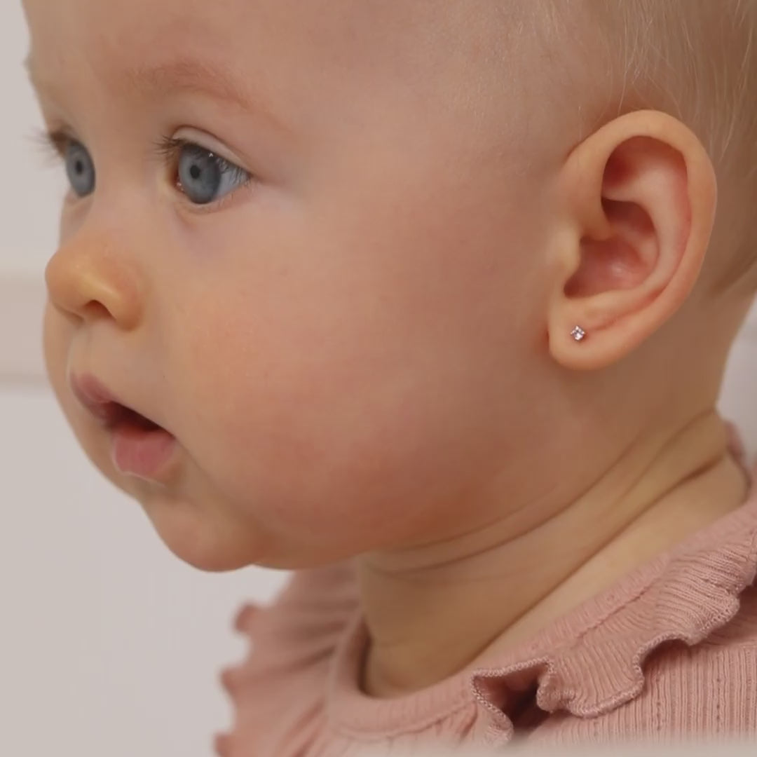These beautiful clear prong set cubic zirconia earrings were crafted in 14k yellow gold perfect for babies and little girls with sensitive ears. High polished for long lasting shininess and durable quality, these classic and timeless earrings for girls come with screw backs which is a safety back that screws on and locks thus preventing for any poking in the back of the earlobe and lessening chances of lost earrings.
