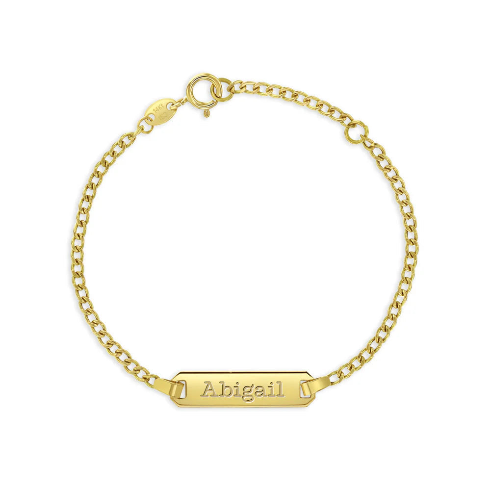 This 14k Yellow Gold Curb Chain Bracelet is a timeless piece, designed especially for children with both elegance and comfort in mind. Its sleek curb chain style is durable yet lightweight, making it great for everyday wear. The bracelet features a polished plate that can be personalized with engraving, making it a thoughtful choice as an identification bracelet or a keepsake gift. Crafted with high-quality 14k yellow gold, it’s hypoallergenic and safe for delicate skin. Ideal for special occasions or as a cherished accessory, this bracelet combines practicality and sophistication beautifully. A Window Box is included with purchase.