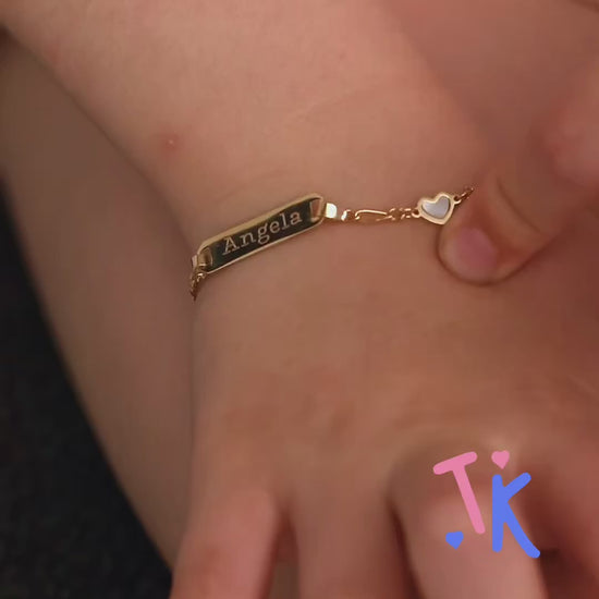 Make your little one’s jewelry collection even more special with this beautiful baby girl’s identification bracelet. Crafted from 14K yellow gold, this dainty yet durable piece is adorned with a heart shaped mother of pearl charm, adding a touch of elegance and sweetness. The polished ID plate offers a perfect space for engraving a name, creating a treasured keepsake or a meaningful gift.