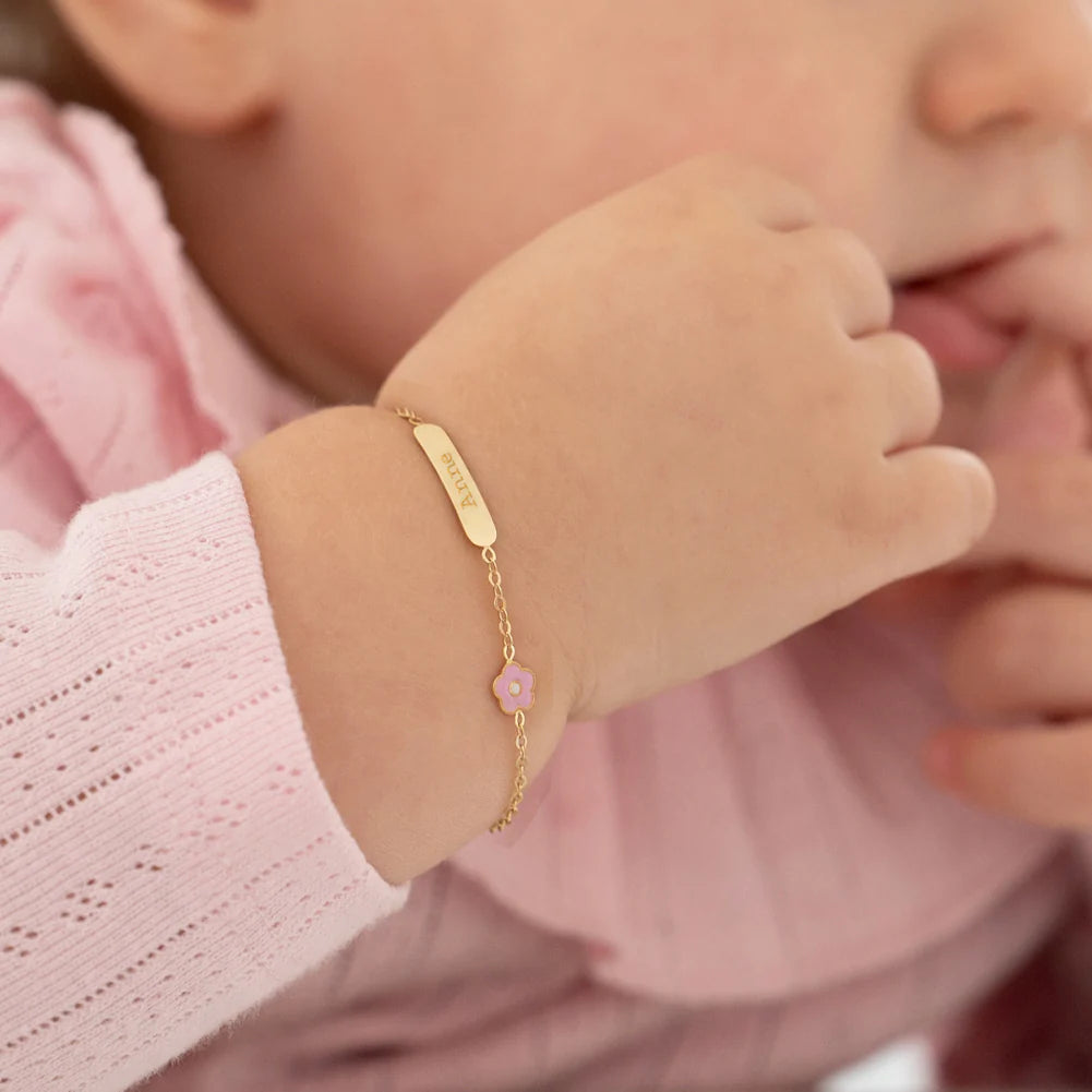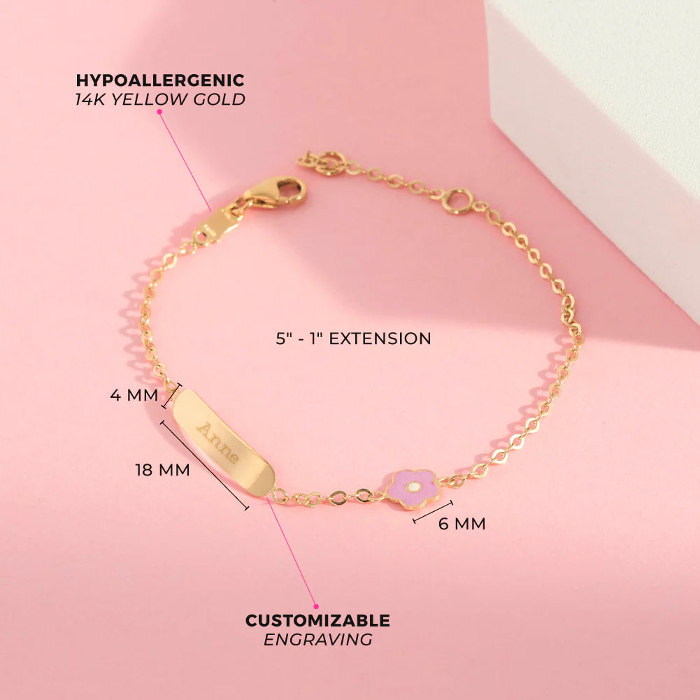 Our darling little girl's tag identification bracelet, are crafted with care from hypoallergenic 14k yellow gold. Designed to capture the innocence and charm of childhood, this bracelet is adorned with a delicate pink enamel flower charm detail, adding a touch of whimsy and sweetness. With a length of 5 inches and an adjustable 1-inch extension, it ensures a great fit for your little one's wrist.
