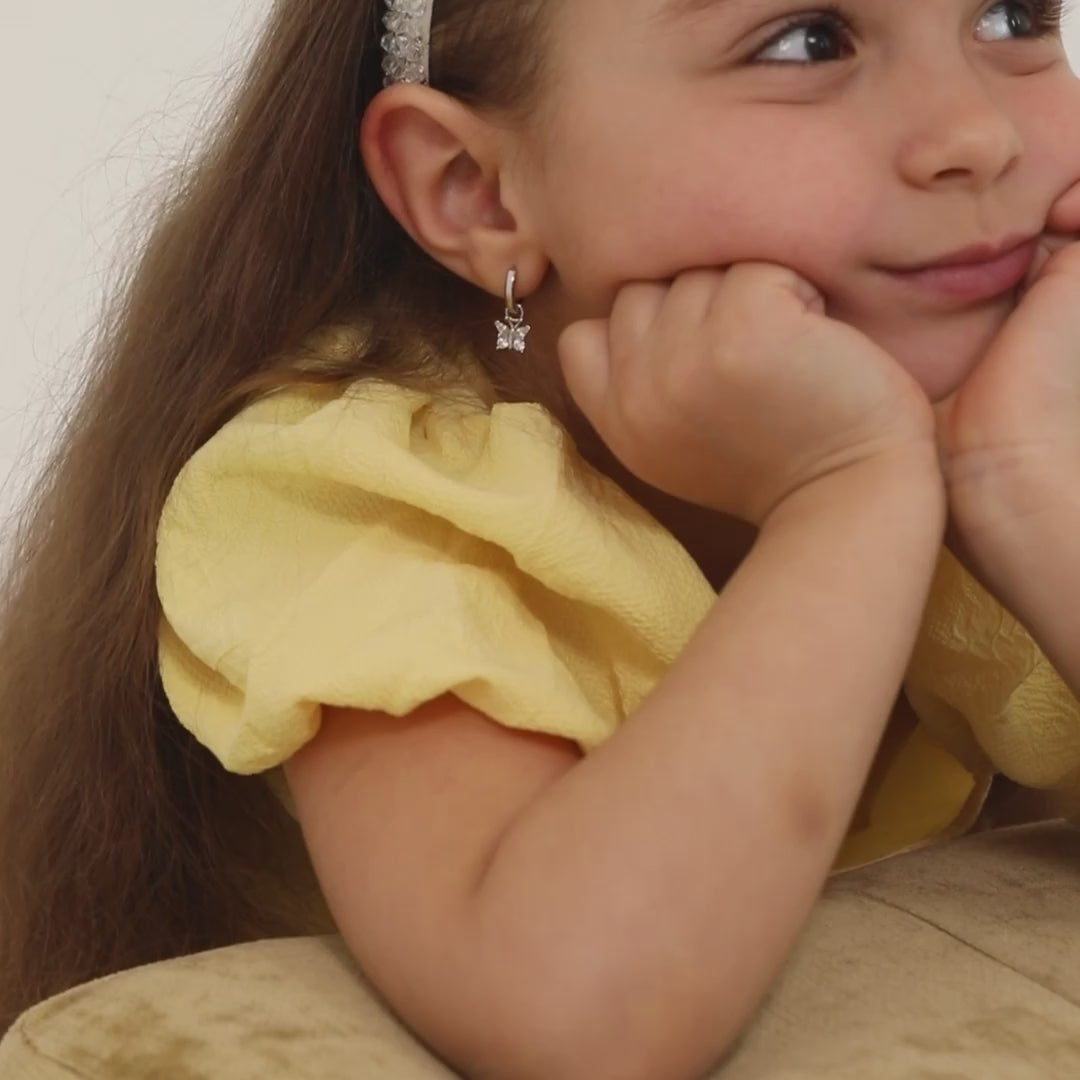 Beautifully designed butterfly dangle hoop earrings that every young girl would love to receive. These gorgeous earrings feature 4 cubic zirconia stones that represent the wings of the butterfly. Crafted in a 925 sterling silver, making it safe and comfortable for young girls who have sensitive skin. These cute earrings make a great gift for any occasion for your favorite butterfly loving little girl.